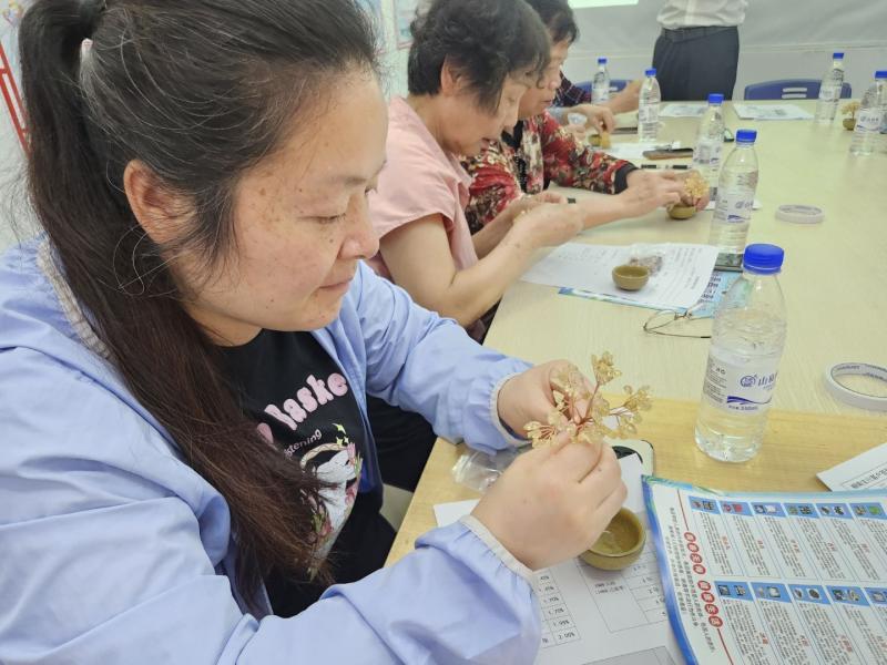 活动现场,社区工作人员为大家分发材料并讲解制作步骤,从搭配花枝到固定造型,耐心指导每一位居民制作专属“福树”。居民们围坐在一起,边制作边交流,现场欢声笑语不断。大家用灵巧的双手,将零散的干花材料组合成精致的福树摆件,每一件作品都承载着对生活的美好期许。